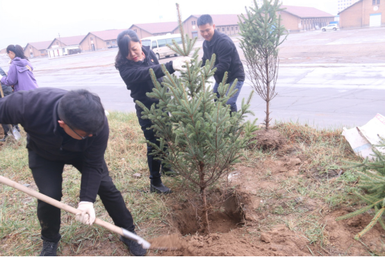 在園區(qū)內,大家興致勃勃,干勁十足,有的揮鍬挖坑、有的搬運樹苗、有的扶苗培土、有的提水澆灌,經過3個小時的忙碌,100棵松柏昂然挺立,呈現出一派生機勃勃的景象。