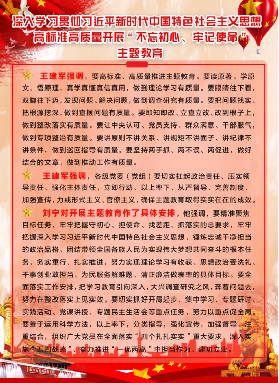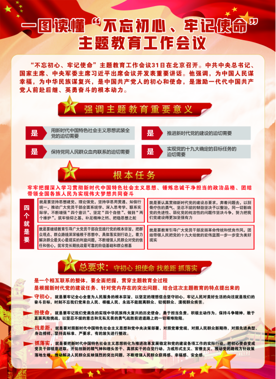 由集團(tuán)黨委副書記、總經(jīng)理劉玲同志宣讀《集團(tuán)黨委開展"不忘初心、牢記使命"主題教育實(shí)施方案》。集團(tuán)黨委書記、董事長(zhǎng)王玉輝同志作了"不忘初心、牢記使命"主題教育動(dòng)員講話,對(duì)集團(tuán)系統(tǒng)開展主題教育工作進(jìn)行了安排部署,要求把主題教育與完成本單位轉(zhuǎn)型升級(jí)、項(xiàng)目建設(shè)、生產(chǎn)經(jīng)營(yíng)等工作任務(wù)結(jié)合起來,切實(shí)把主題教育成果轉(zhuǎn)化為企業(yè)發(fā)展的強(qiáng)大動(dòng)力,推動(dòng)青海物產(chǎn)高質(zhì)量發(fā)展。省委"不忘初心、牢記使命"主題教育第十二巡回指導(dǎo)組組長(zhǎng)任正德同志做了指導(dǎo)講話。充分肯定了集團(tuán)黨委的前期工作,認(rèn)為會(huì)議準(zhǔn)備比較充分,有效統(tǒng)一了干部職工的思想,制定的主題教育《實(shí)施方案》操作性強(qiáng),目標(biāo)任務(wù)具體,動(dòng)員講話政治站位高,思想認(rèn)識(shí)深,工作思路清晰。同時(shí),結(jié)合工作組的職責(zé)就落實(shí)主題教育各項(xiàng)任務(wù)講了六點(diǎn)意見。一是聚焦根本任務(wù);二是把握"十二"字總要求;三是緊扣"五句話"總目標(biāo);四是落實(shí)"四個(gè)貫穿";五是抓實(shí)"六項(xiàng)重點(diǎn)"舉措;六是力戒形式主義,嚴(yán)禁主題教育走形式、走過場(chǎng)。