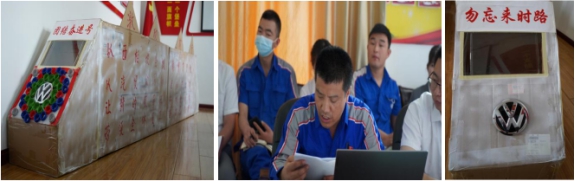 西柏坡精神是部生動(dòng)的教科書(shū),車間工人黨員袁有德利用平時(shí)裝配件的紙盒子,創(chuàng)意性地制做了一列"團(tuán)結(jié)奮進(jìn)號(hào)"火車,邀請(qǐng)黨員一起乘車前行。袁有德說(shuō):"團(tuán)結(jié)奮進(jìn)號(hào)"列車蘊(yùn)含著學(xué)習(xí)西柏坡精神,強(qiáng)企富家、團(tuán)結(jié)奮進(jìn)的寓意,車頭前面的"大眾"標(biāo)識(shí)代表公司經(jīng)營(yíng)的品牌;八個(gè)綠色的大美孚機(jī)油蓋代表八方來(lái)財(cái),所有蓋口都向外代表招攬客戶,減少流失,而且像螺絲釘一樣牢牢釘??!車頭車尾標(biāo)有"勿忘來(lái)時(shí)路"的字樣,以此提醒廣大黨員干部不忘初心、牢記使命,一定不要忘記來(lái)時(shí)的路,回顧過(guò)去,展望未來(lái),讓"團(tuán)結(jié)奮進(jìn)"號(hào)列車在西柏坡精神的感召下前行。支部要求,在疫情防控和汽車行車嚴(yán)竣的形勢(shì)下,我們每一個(gè)物產(chǎn)汽貿(mào)員工都是新時(shí)代的答卷者,讓"團(tuán)結(jié)奮進(jìn)號(hào)"奔馳在新時(shí)代的征程上,承載著中國(guó)夢(mèng)、物產(chǎn)夢(mèng),承載著物產(chǎn)汽貿(mào)職工群眾對(duì)美好生活的向往,風(fēng)馳電掣,勇往直前,奔向未來(lái)!