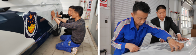 圖5為:售后漆工冶龍正在為警車貼警徽標(biāo)志,他說:“警車是公務(wù)用車,每次粘警飾我都感到很神圣,干活兒特別用心細致,一定要把車身警飾做得非常好才行。警徽閃耀,守望千家萬戶。我是漆工也是工匠,必須精益求精,把活兒干漂亮,這也是汽貿(mào)漆工的臉面。每次我都把車清洗干凈,用卷尺量好間距,用記號筆畫好。在貼的過程中用刮板反復(fù)擠壓空氣,這樣才能使警徽粘得更牢固更美觀。我要把公司倡導(dǎo)的勞動精神、工匠精神,通過不斷地學(xué)習(xí)鍛煉,提高本領(lǐng),把精湛的工匠手藝和貼心的服務(wù)傳遞給社會。