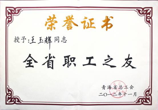 在2012年11月23日召開的青海省工會(huì)第13次代表大會(huì)上,省總工會(huì)對(duì)全省優(yōu)秀個(gè)人、模范集體進(jìn)行了表彰。集團(tuán)總經(jīng)理王玉輝同志榮獲"全省職工之友"榮譽(yù)稱號(hào);青海物產(chǎn)物資配送有限責(zé)任公司工會(huì)榮獲"全省模范職工之家"榮譽(yù)稱號(hào);馬軍同志榮獲"全省優(yōu)秀工會(huì)積極分子"榮譽(yù)稱號(hào);丁勇同志榮獲"全省優(yōu)秀工會(huì)工作者"榮譽(yù)稱號(hào)。