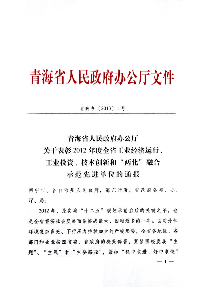 2012年,青海省物產(chǎn)集團總公司在省委、省政府及省國資委的大力支持和領(lǐng)導(dǎo)下,集團總公司按照全省工業(yè)經(jīng)濟總體部署和要求,著力推進工業(yè)項目建設(shè),榮獲"2012年度工業(yè)投資貢獻獎"。