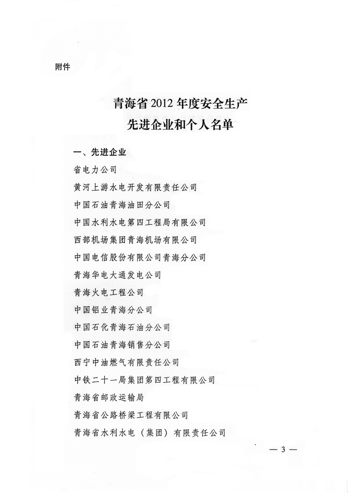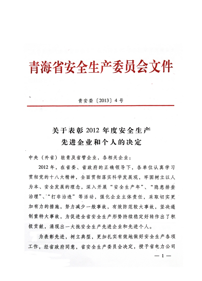 2012年,在省委、省政府的正確領(lǐng)導(dǎo)下,青海省物產(chǎn)集團總公司認(rèn)真學(xué)習(xí)貫徹黨的十八大精神,全面貫徹落實科學(xué)發(fā)展觀,牢固樹立以人為本、安全發(fā)展的理念,深入開展"安全生產(chǎn)年"、"隱患排查治理"、"打非治違"等活動,為促進(jìn)全省安全生產(chǎn)形勢持續(xù)穩(wěn)定好轉(zhuǎn)做出了積極貢獻(xiàn)。為此,經(jīng)省政府同意,省安全生產(chǎn)委員會決定授予青海省物產(chǎn)集團總公司"2012年度安全生產(chǎn)先進(jìn)企業(yè)"榮譽稱號。